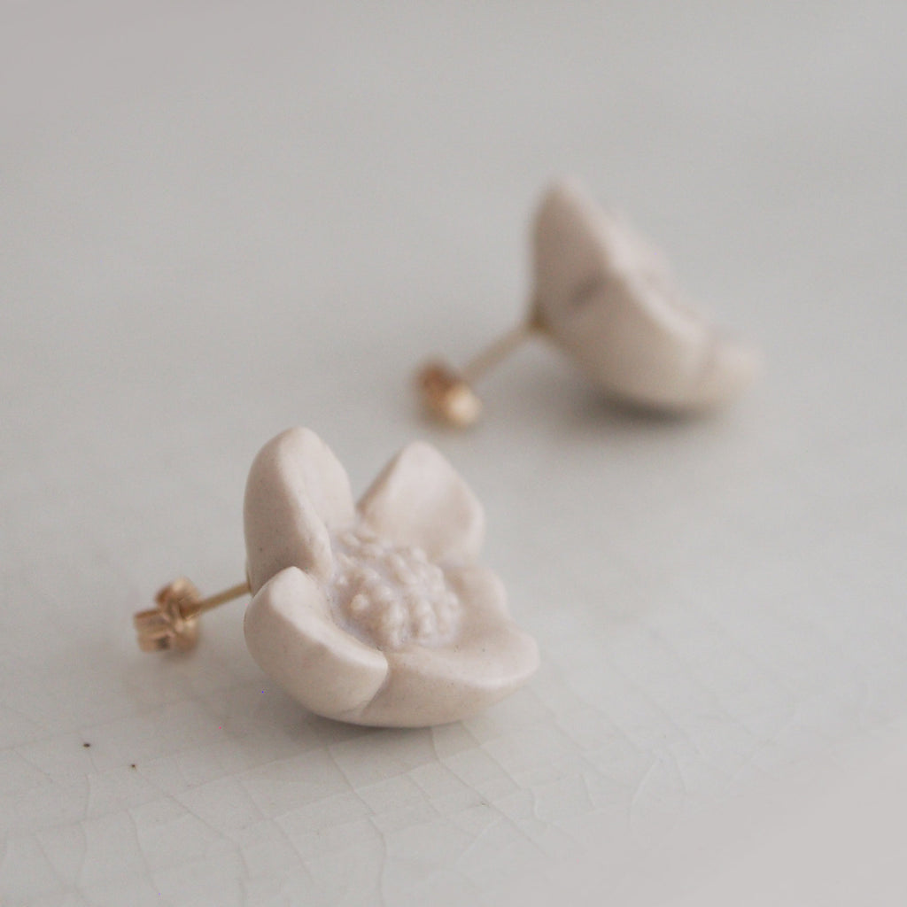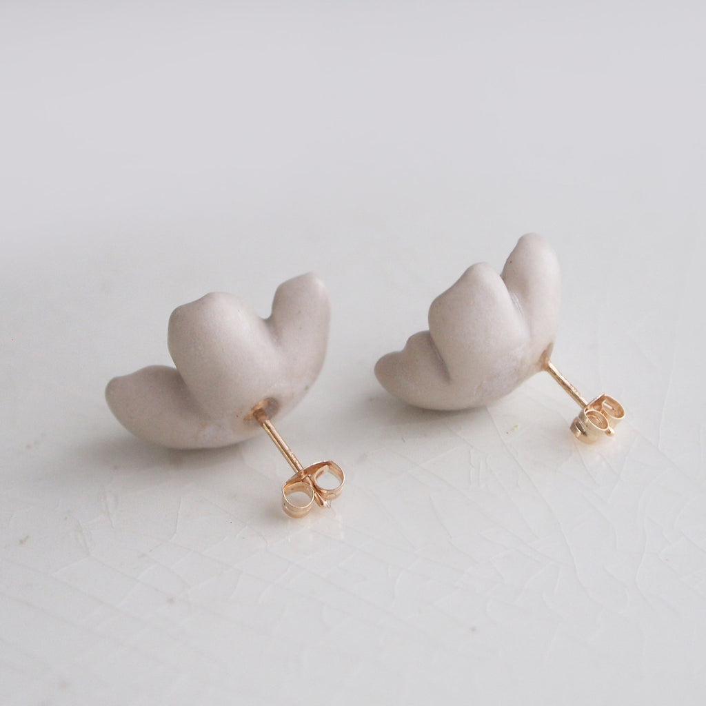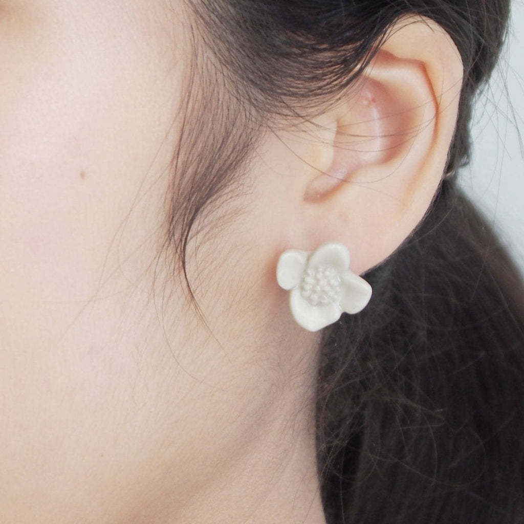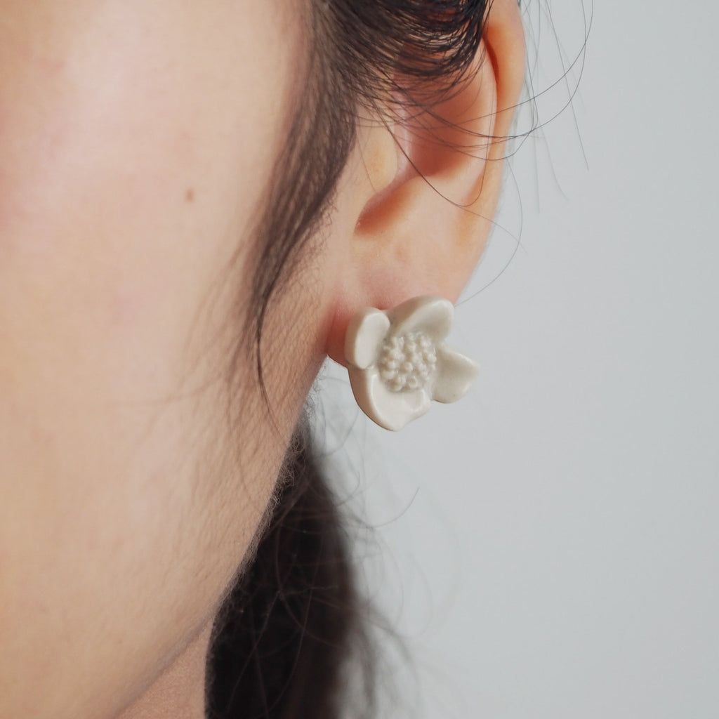 The round silhouette and the three-dimensional shape of the camelia earrings give an elegant impression. The design is easy to blend casually with any outfit.