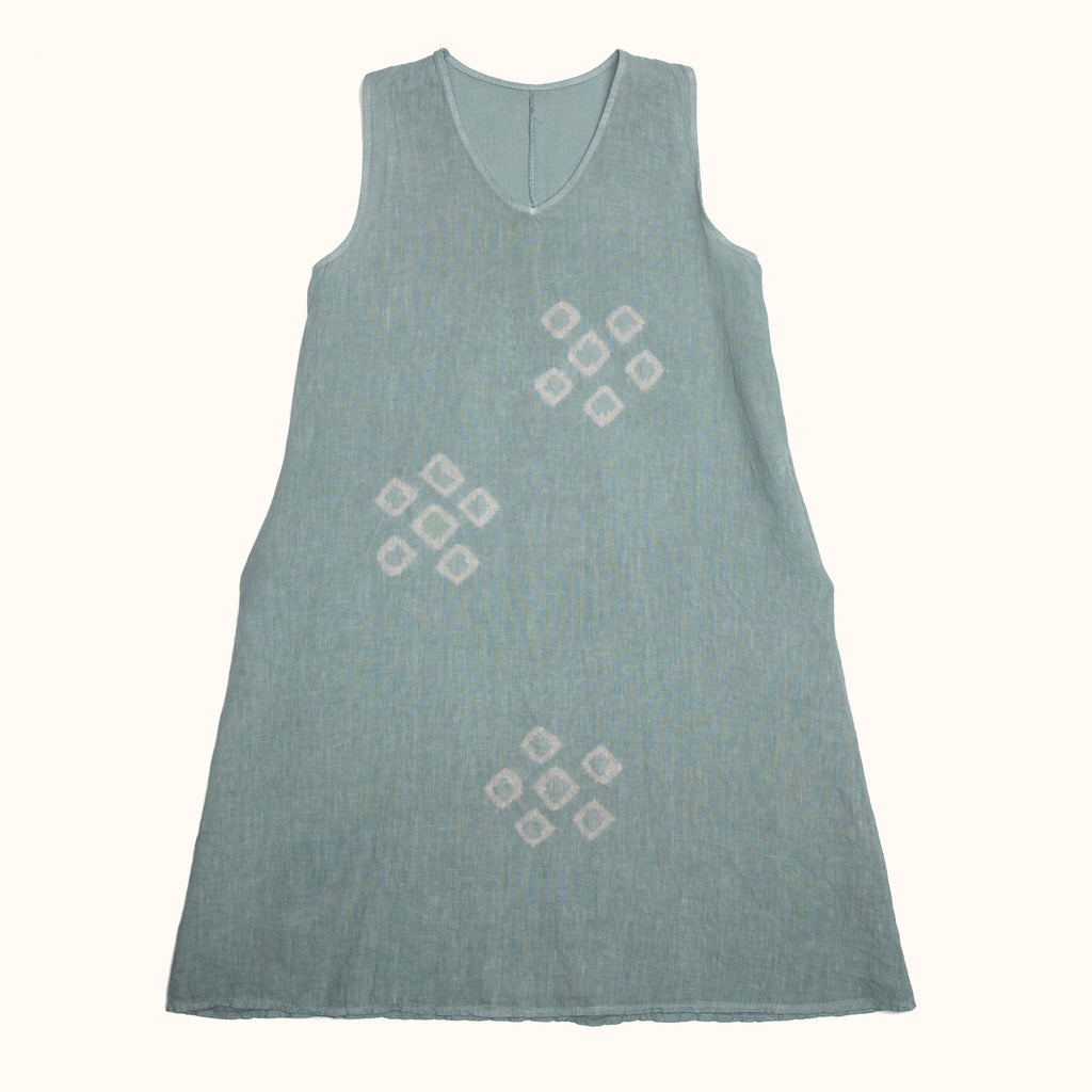 FLOWER SHIBORI LINEN DRESS - Glacier Blue