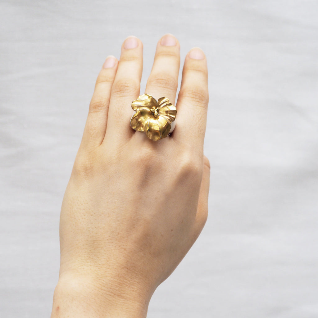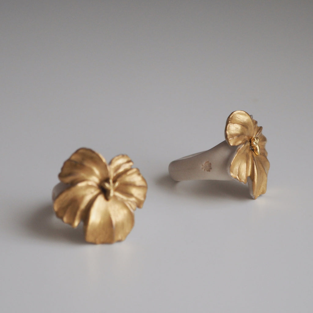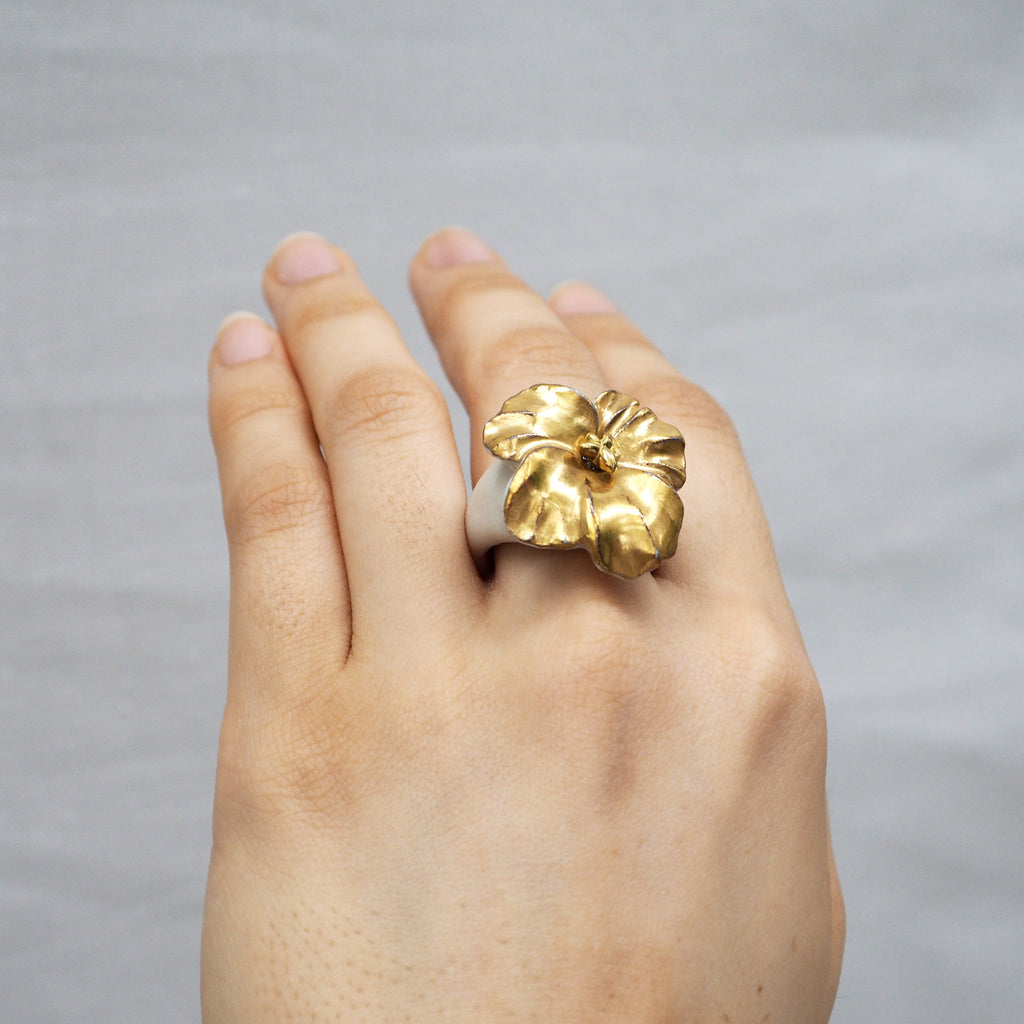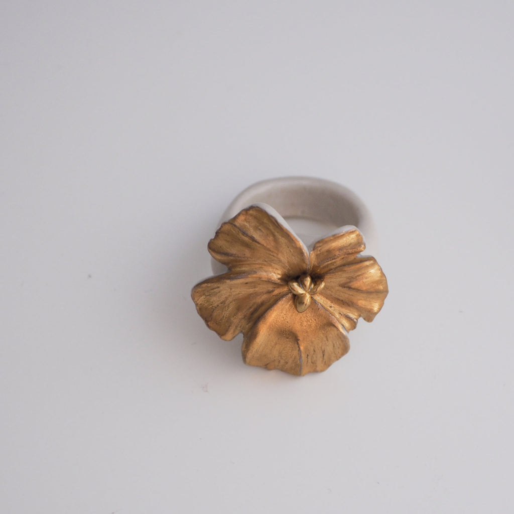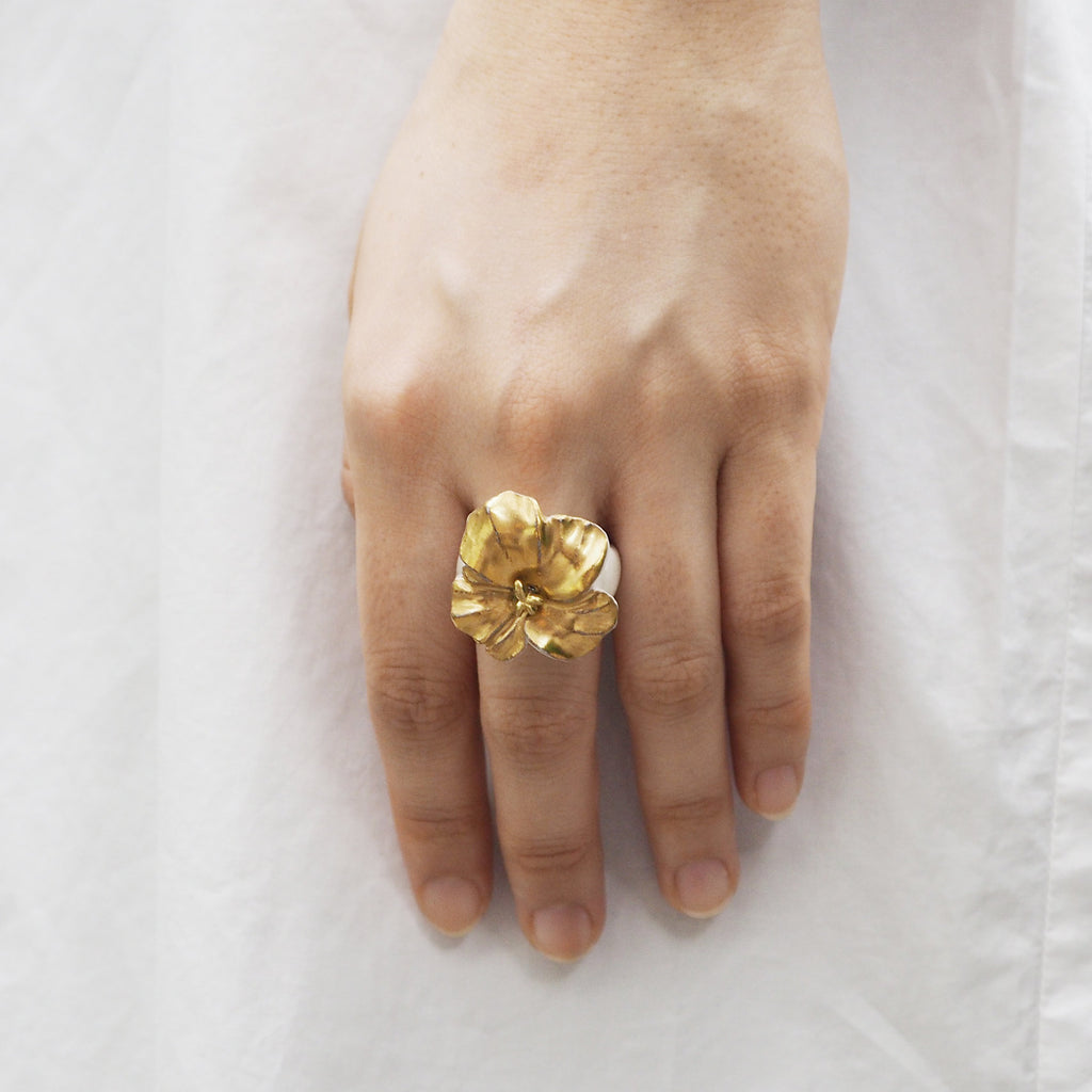It is a ring that wears the beauty of gold drawn with a brush and the loveliness of pansies.