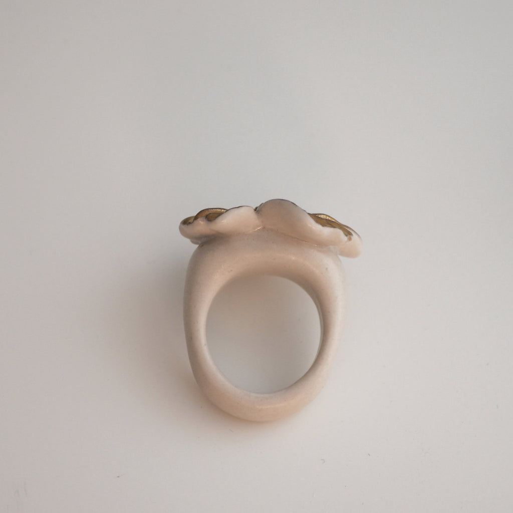A ring with gold on white porcelain with a pansy motif. The one-sided gold color shows a rich expression with the elegant lines of the petals and the natural three-dimensional effect.