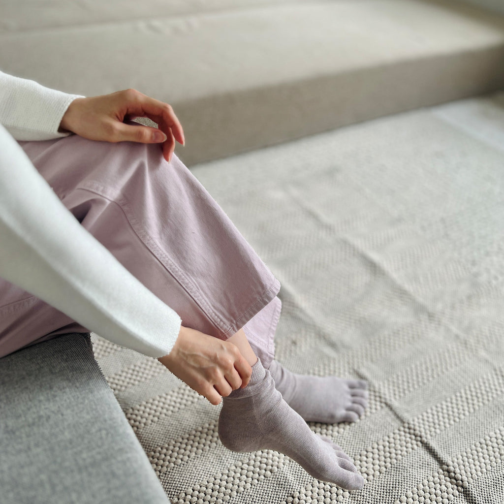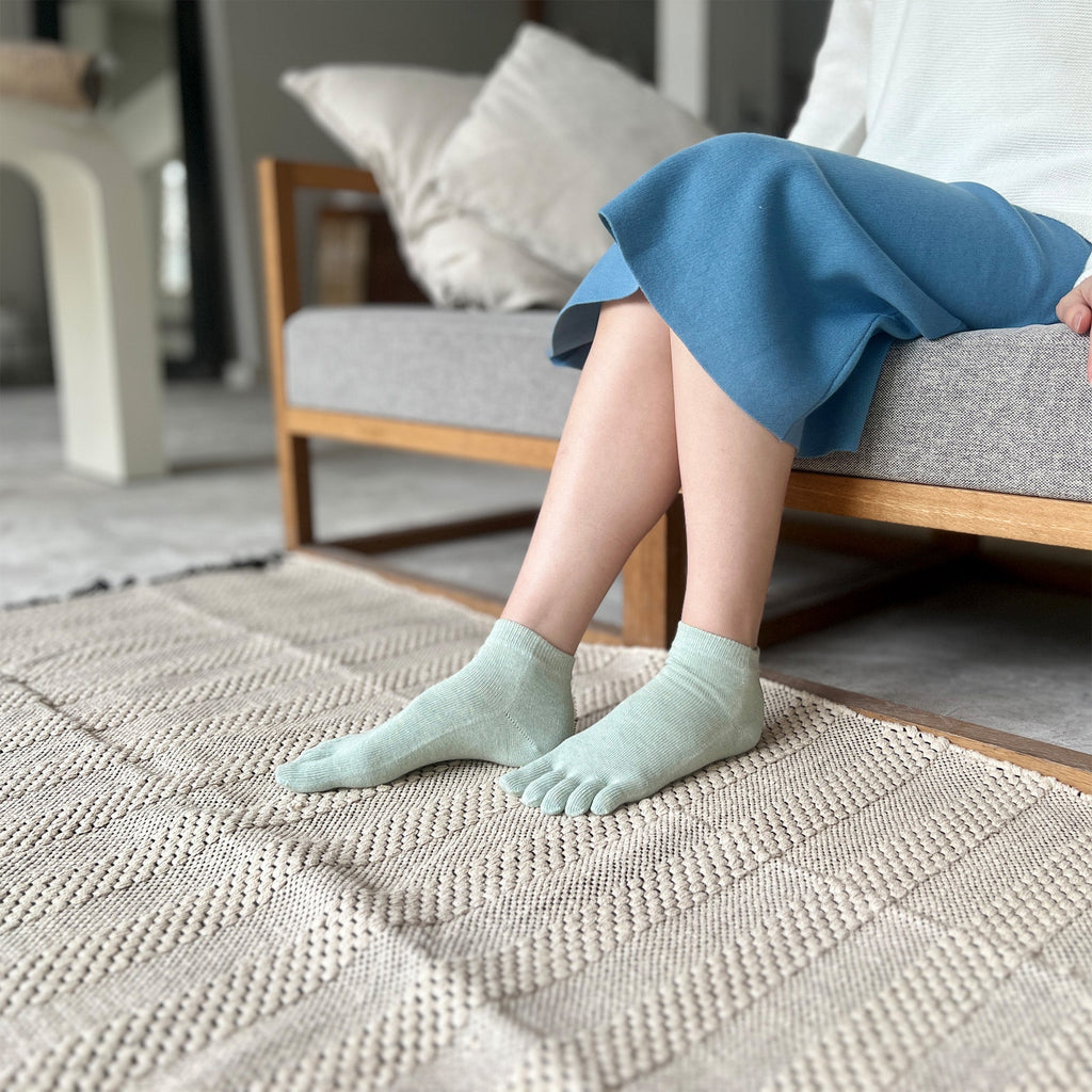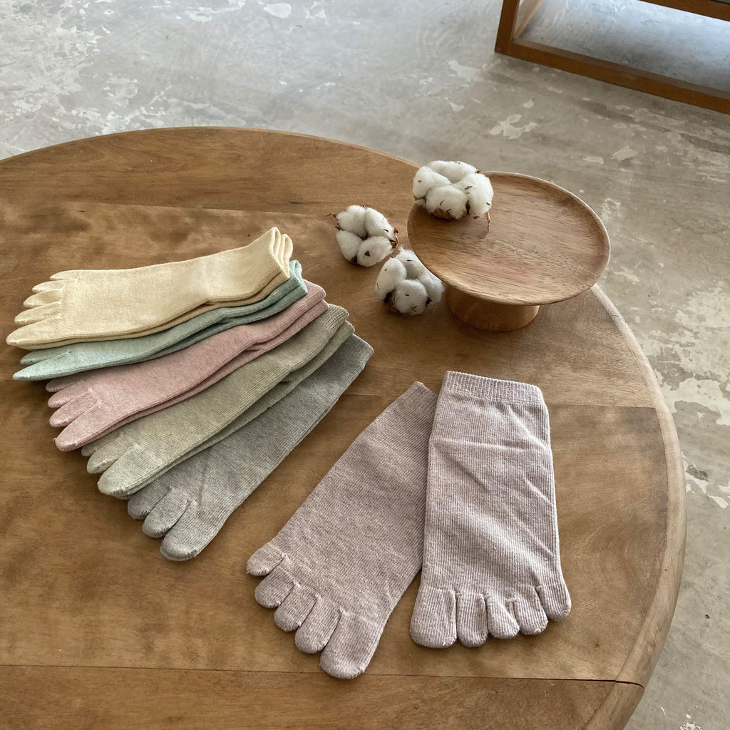 Organic cotton, produced without any pesticides or chemical fertilizers and safe botanical dyes extracted from natural plants, make these socks an all-natural product. These five-finger socks are carefully knitted. They feel great, indoors and outdoors. These five-finger socks absorb excess sweat and reduce the unpleasant feeling of stuffiness, keeping your feet comfortable all day long.
